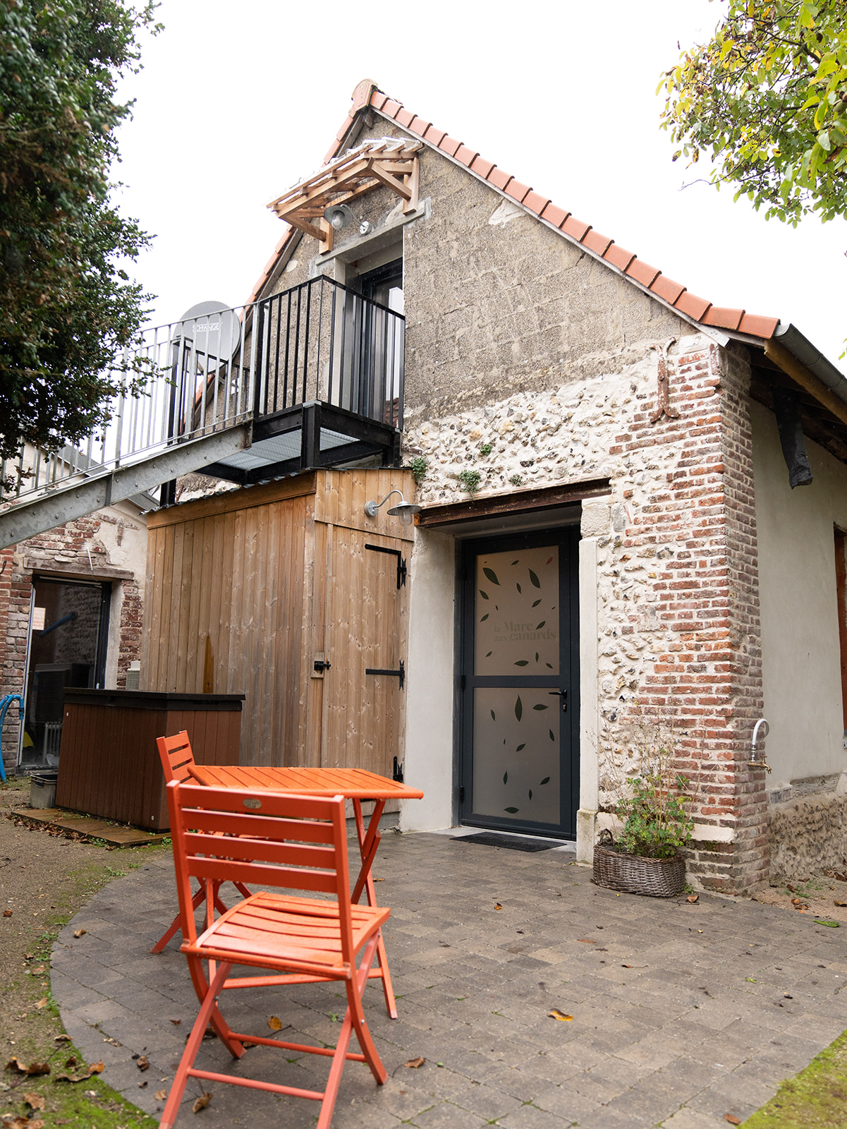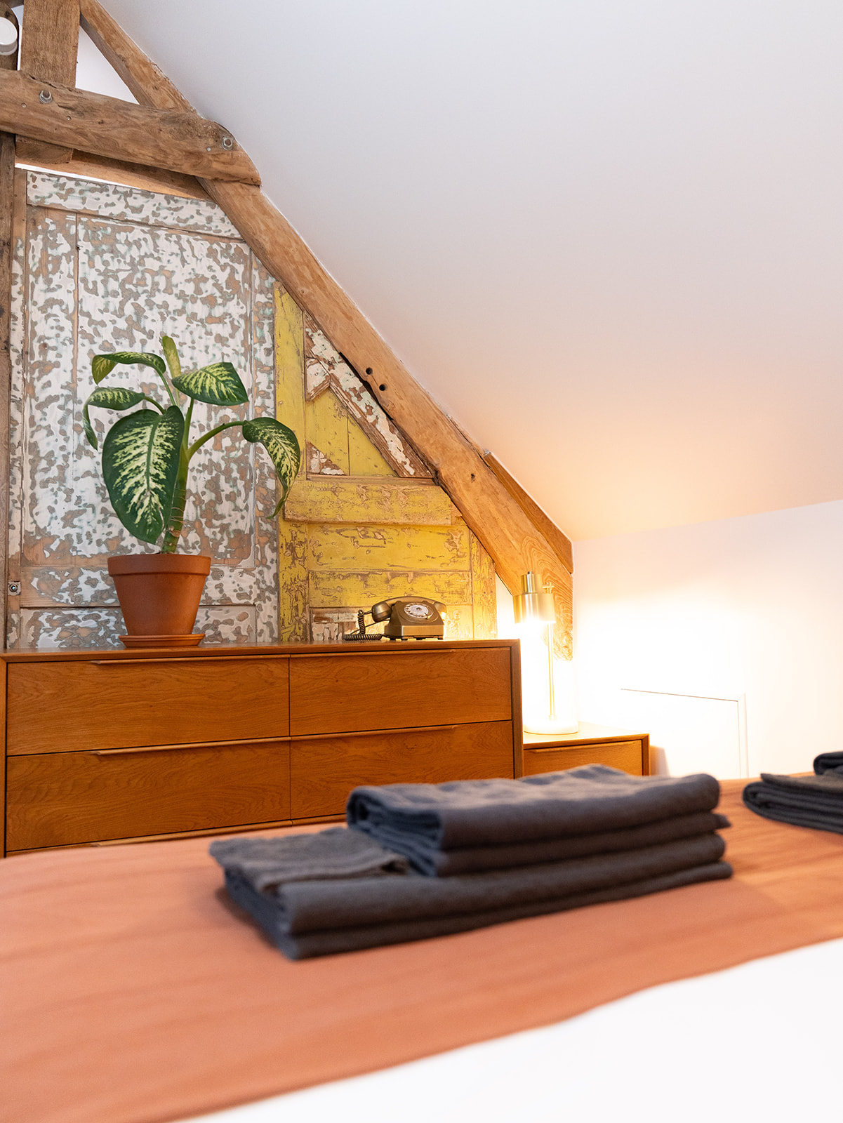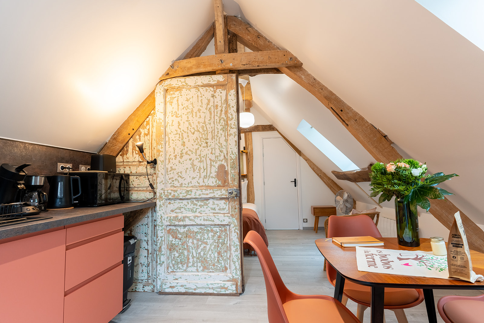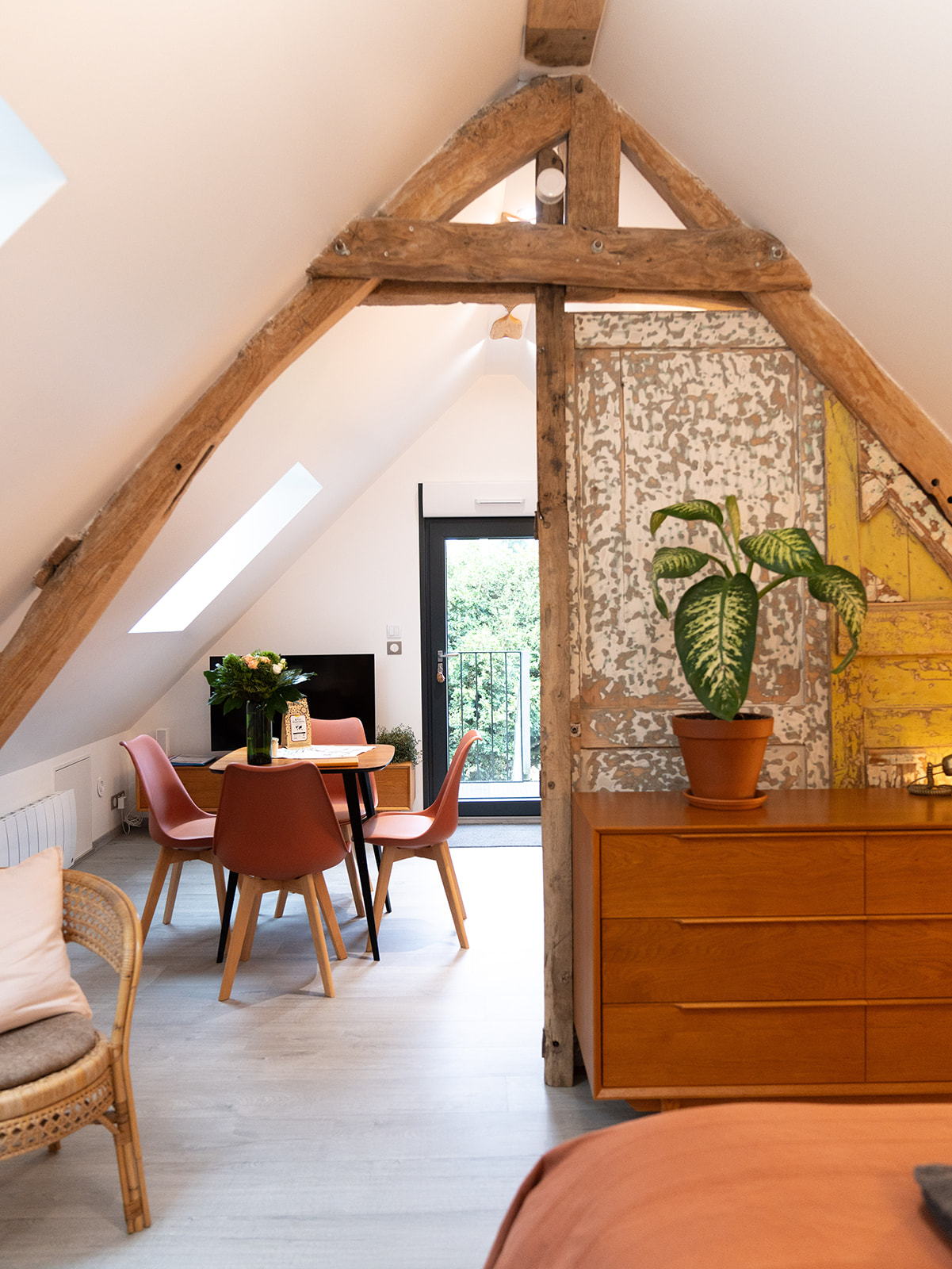 En haut des escaliers vous accédez au studio situé à l’étage d’une grange réhabilitée avec amour, patience et savoir-faire.