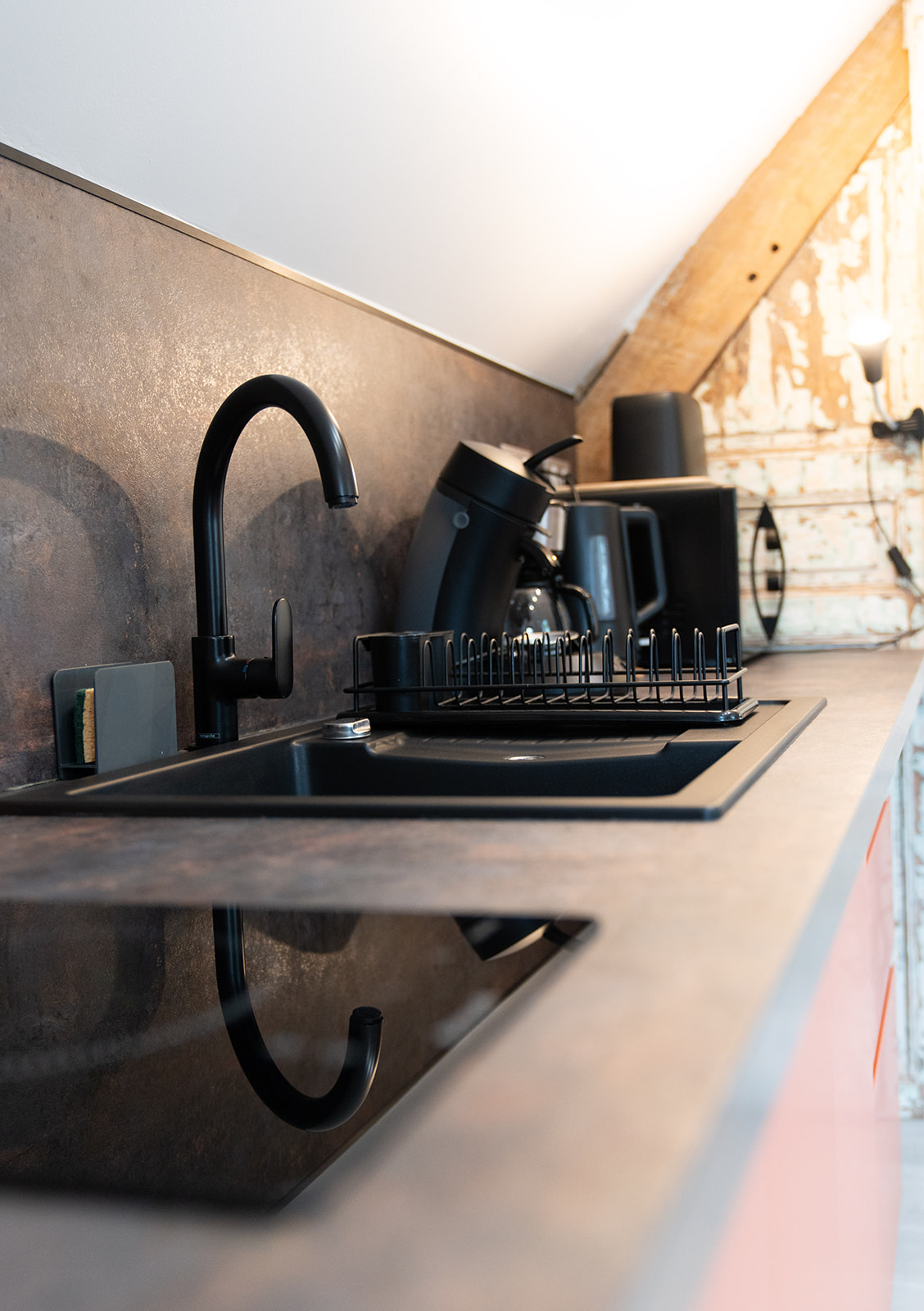 Vous poussez la porte et arrivez dans un coin cuisine équipée et salon avec TV. Après une séparation en portes transformées et poncées pour l’occasion, votre chambre vous attend: deux lits simples ou un lit double, au choix.